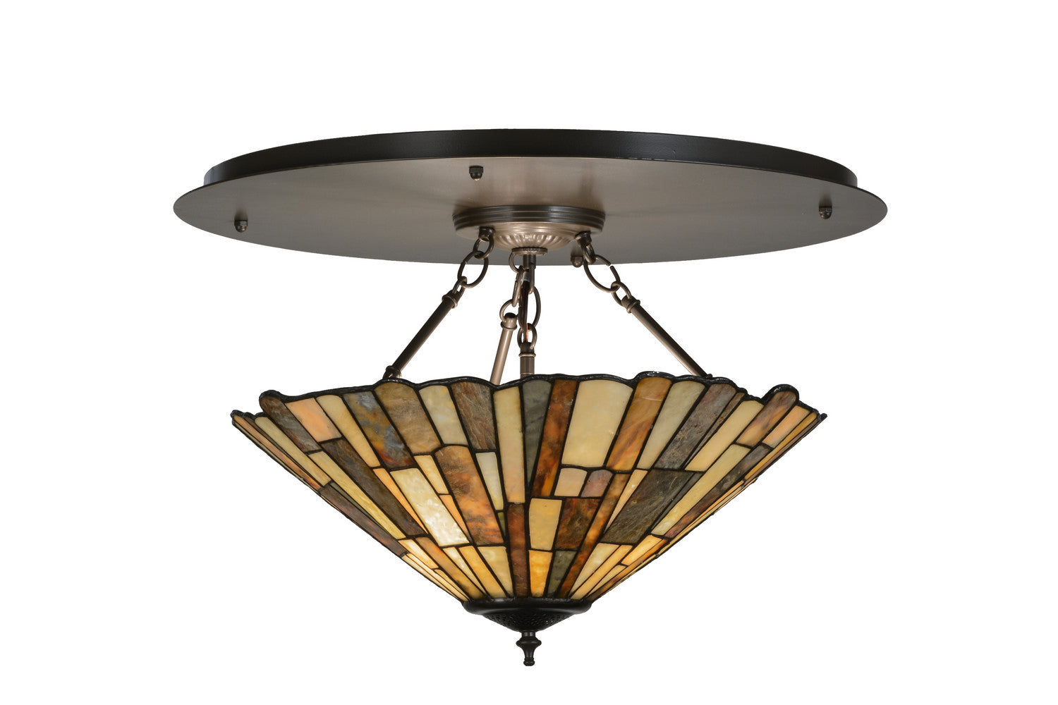 Meyda Tiffany Lighting 151905 Delta Three Light Flushmount Ceiling Light Bronze / Dark Art Glass Multicolor. Please refer to the datasheet for all product specifications. Meyda Tiffany Lighting MPN: 151905