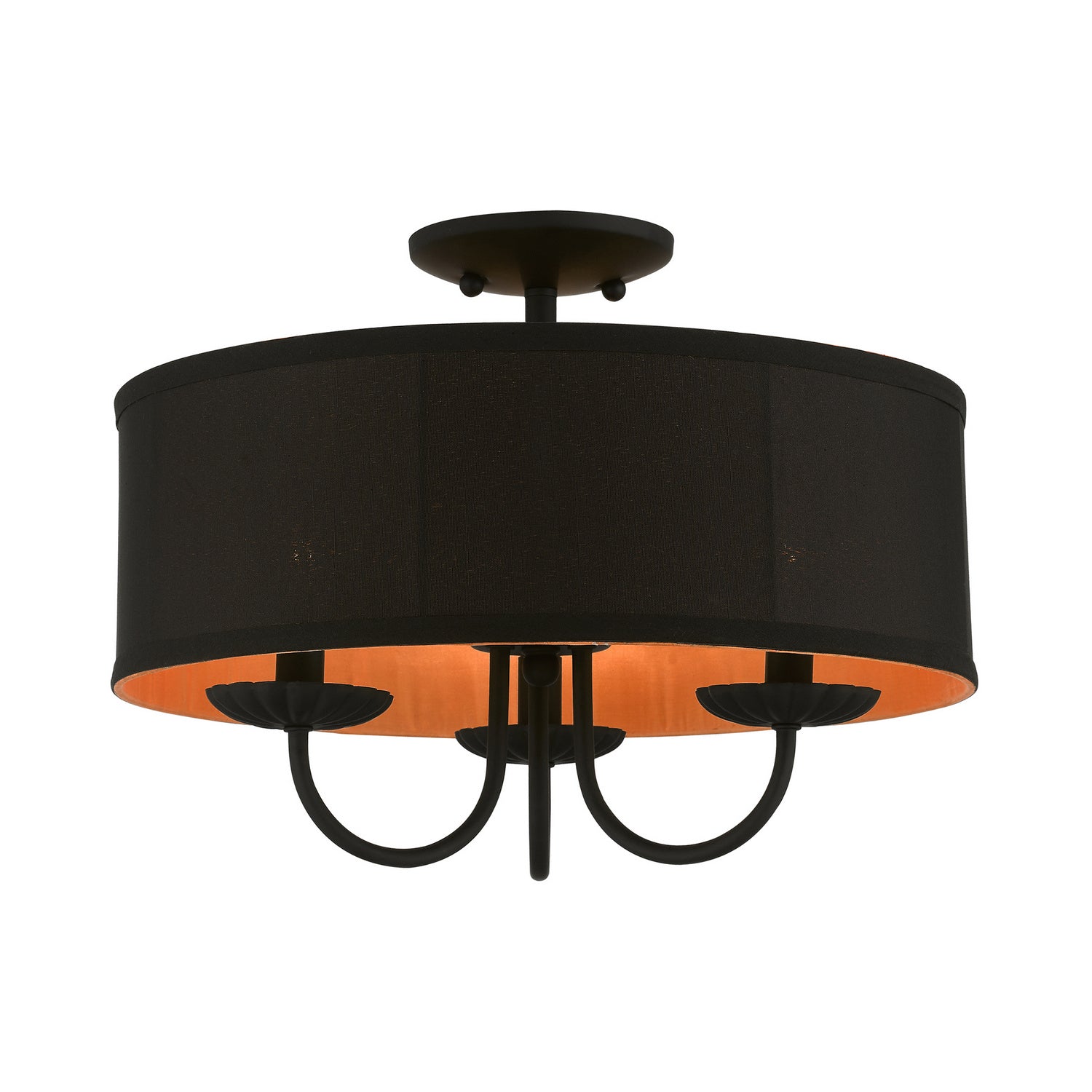 Livex Lighting 45129-04 Winchester Three Light Semi-Flush Mount Ceiling Light Black Transitional Black Fabric Hardback Shade With Orange Fabric Inside. Please refer to the datasheet for all product specifications. Livex Lighting MPN: 45129-04
