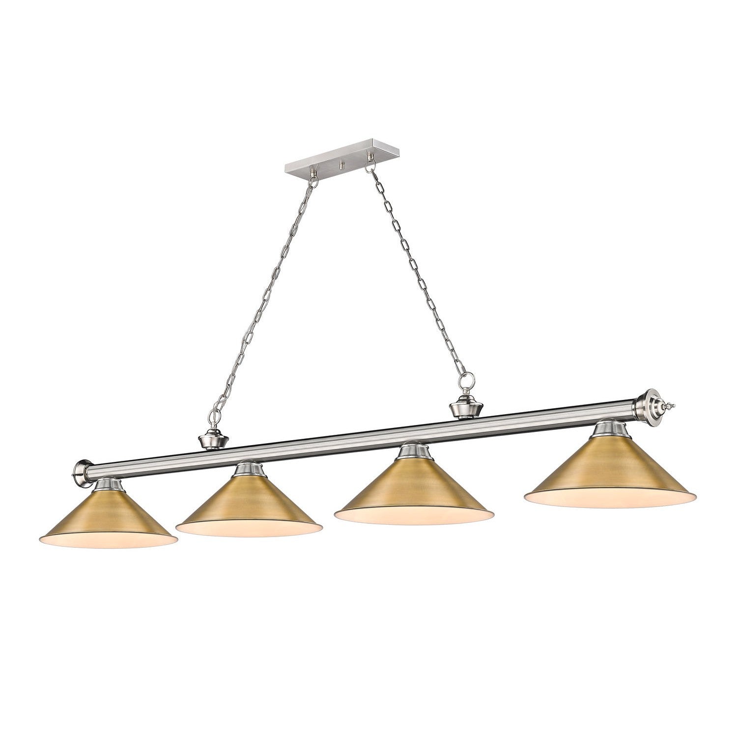 Z-Lite Lighting 2306-4BN-RB15 Cordon Four Light Billiard Pendant Light Pewter, Nickel, Silver Transitional Rubbed Brass. Please refer to the datasheet for all product specifications. Z-Lite Lighting MPN: 2306-4BN-RB15