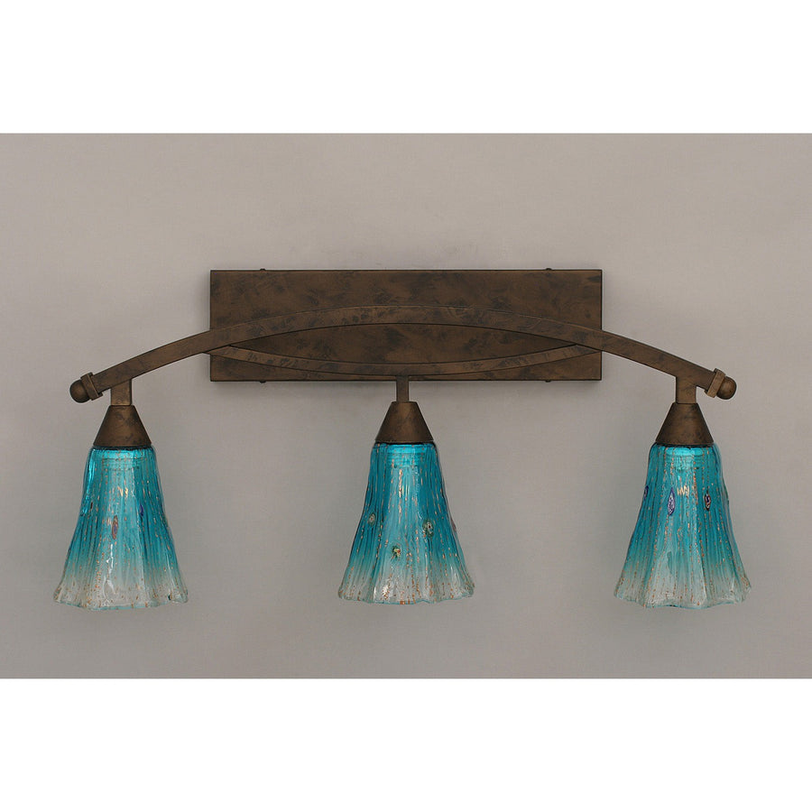 Toltec Lighting 173-BRZ-725 Bow Three Light Bath Bar Bath Vanity Light Bronze / Dark Art Glass Blue. Please refer to the datasheet for all product specifications. Toltec Lighting MPN: 173-BRZ-725